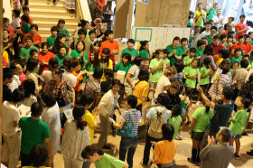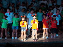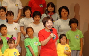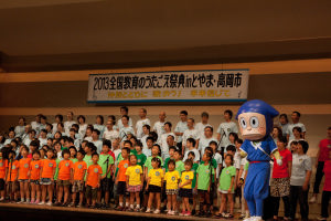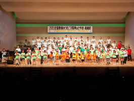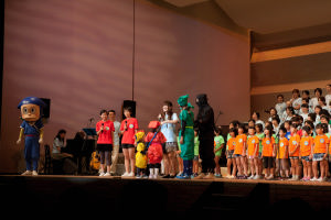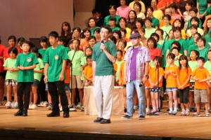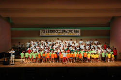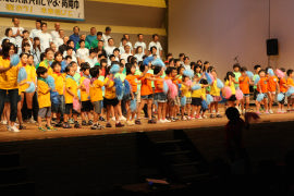 各団体の自己紹介のあと、「♪大空へ飛べ」「♪ぞうれっしゃよ走れ」「♪笑顔がかさなれば」など、