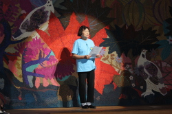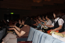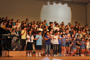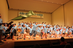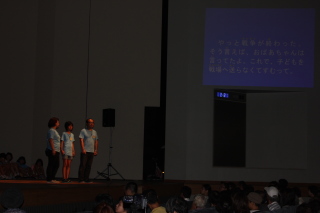 ♪ | 第1部で瀬成田先生が夜行バスで駆けつけ、ステージに参加してくださっていることに感動しました。東北の現状はまだまだ厳しいのですね。第3部では、戦後70年の節目の年にふさわしいすばらしい内容のミュージカルをありがとうございました。大人数でとても迫力があり、子どもたちの元気な声に元気づけられました。ソロのお二人もとっても輝いて見えました。 |