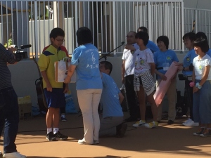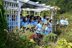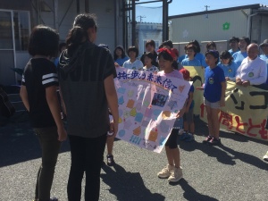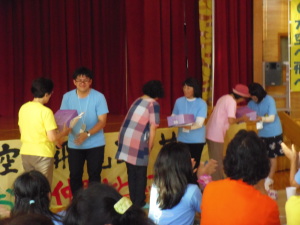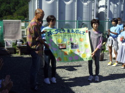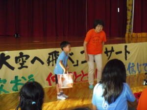 最後に「♪花は咲く」をみなさんと合唱したあと、「大空へ飛べ」からメッセージと富山のお土産を渡しました。