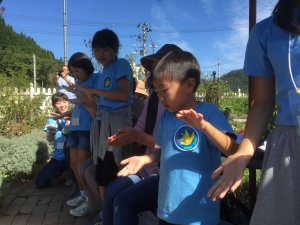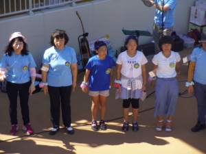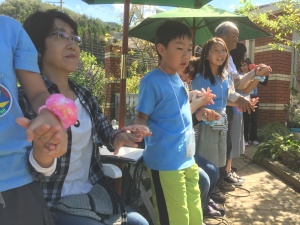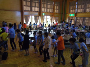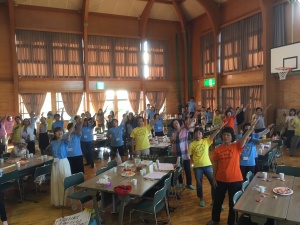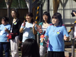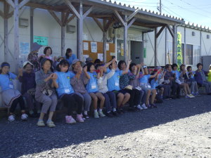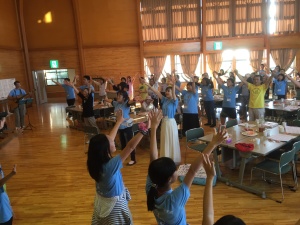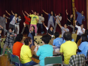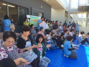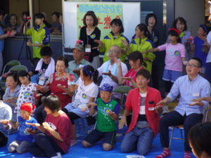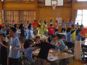 次は「♪笑顔がかさなれば」です。地元の方や向洋中学校のみなさんも一緒に手遊びをしました。