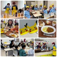 食堂の方は、2部屋をフルに活用し、いつもの2倍ほどの量を作ってお客様を迎えました。メニューは、カレーライス、鶏の唐揚げ、バンサンスー、プチトマト、フルーツポンチ、ドリンクバーでした。相変わらずカレーライスが人気で、おかわりの連続。頭にピカチュウのお面をつけ、自作のエコバックを横に置いて、カレーライスを頬張っている子どもたち。笑顔がキラキラ輝いていました。みんなの心にきっとステキなひとときが刻まれたと思います。