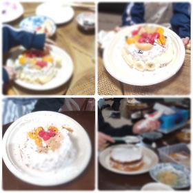 ケーキ作りは、2組に分かれて行い、子どもたちが準備したホイップクリームやフルーツ、チョコスプレーなどで楽しくデコレーション。生クリームたっぷりの美味しそうなケーキが完成しました。みんなで乾杯をして、会食しました。